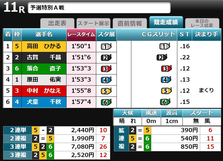 ロケットひかる号のマクリで右隣の6号艇落合直子選手に展開。捲り差し炸裂を期待 買い目5-12=6